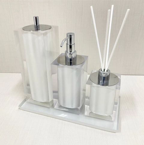 Kit de banheiro 3 peças + bandeja 14x28 em resina cristal pérola com cromado