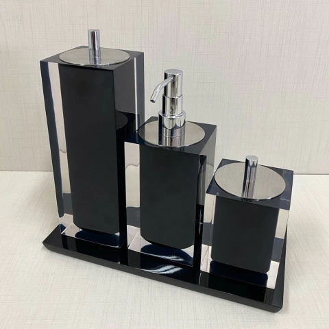 Kit de banheiro 3 peças + bandeja 14x28 em resina cristal preto com cromado